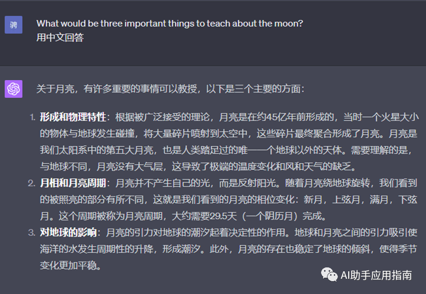 这个问题在没有使用定制指令的情况下,ChatGPT会给出标准的答案,如介绍月亮的物理特性、月亮的周期和对地球的影响等。
