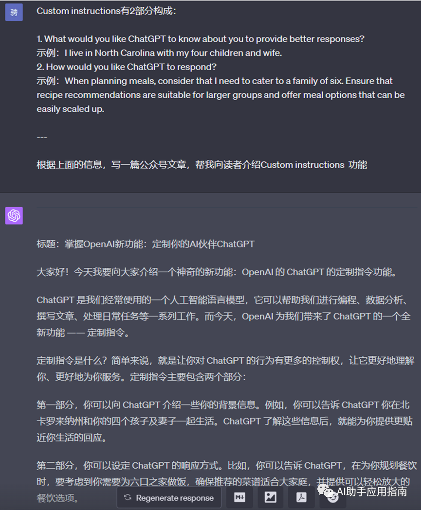 经过设定后,我进行了一系列的测试。首先是让ChatGPT根据提供的“定制指令”的信息,帮我写一篇公众号文章。结果显示,它能够很好地理解并符合我对公众号写作风格的要求。