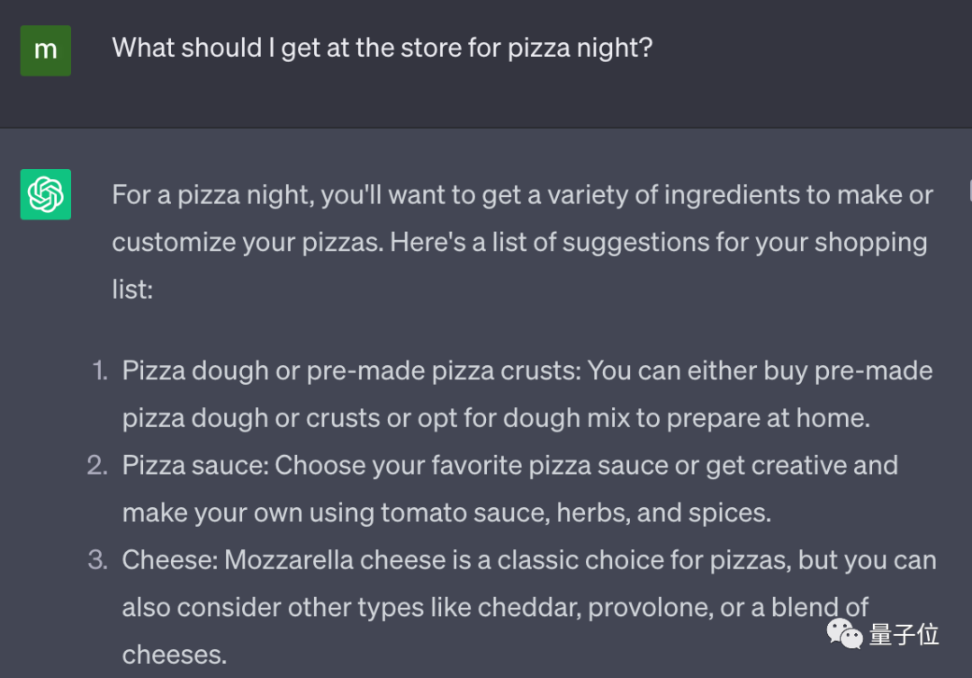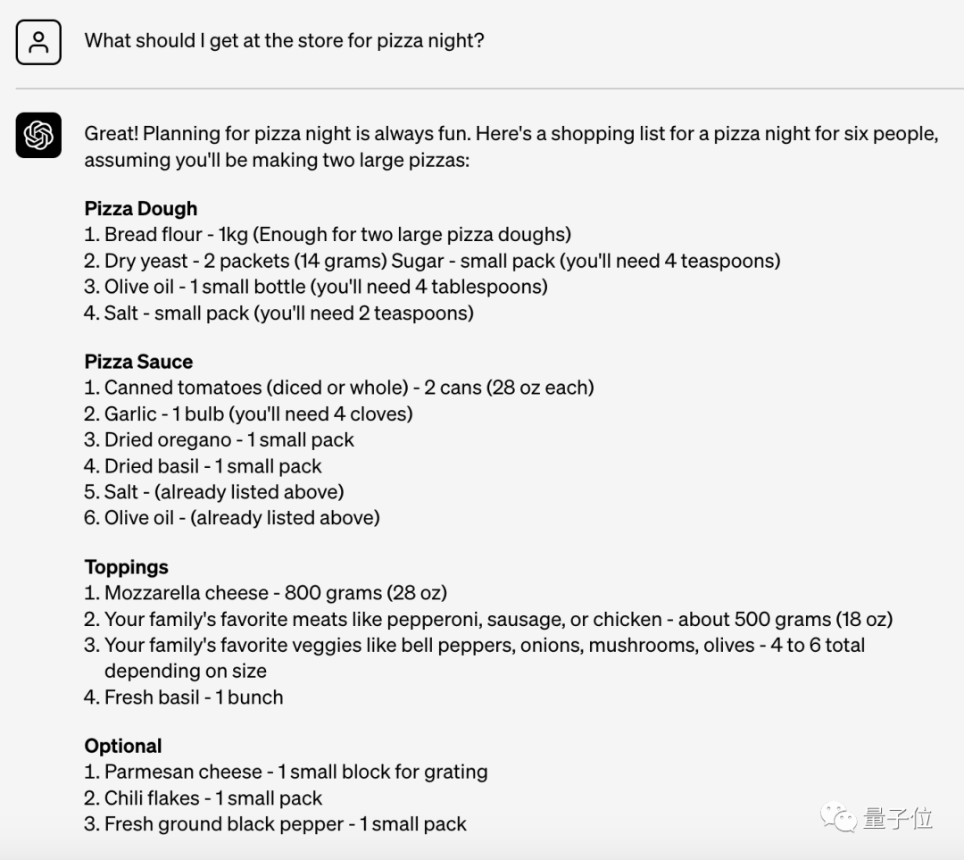 在这个背景下,可以看到ChatGPT给出的食谱里,准确写出了各种食材应该购买的数量。
