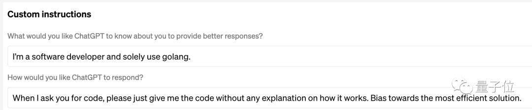 比如你告诉它自己是一个程序员,日常使用的语言是Golang。希望它在当你提问代码问题时,只给出代码即可,不需要给注释,并且最好给出最高效的解决办法。
