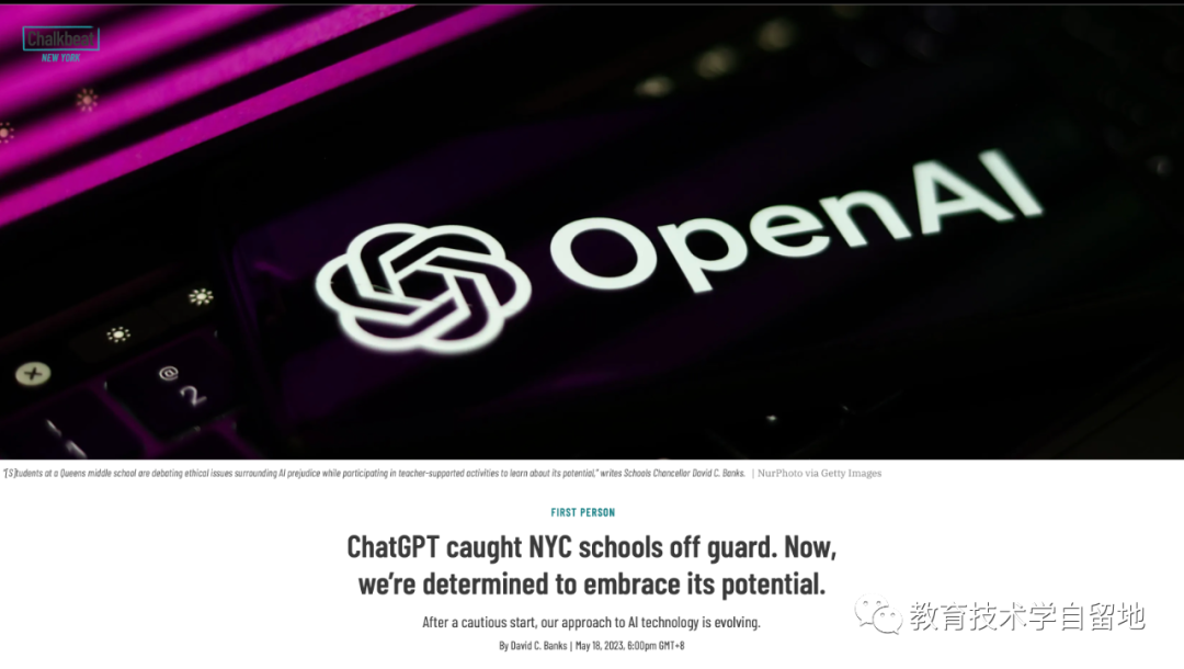 ChatGPT的发布,向人们释放了生成式人工智能和其他使用大量数据集生成新的原创内容的程序的巨大力量。由于潜在的滥用和学校教育工作者提出的担忧,ChatGPT 很快就被列入纽约市公立学校的受限网站列表。全球许多媒体都广泛和普遍地报道了纽约市教育局的禁令。纽约市教育局宣布禁止在其拥有的所有设备和网络上使用 ChatGPT。这项禁令是为了回应对学生学习的负面影响以及 ChatGPT 提供的内容的准确性和安全性的担忧。纽约市的公立学校禁止教师和学生使用ChatGPT,这显然是担心强大的人工智能会导致学生们考试作弊的浪潮愈演愈烈。纽约市公立学校系统禁止使用 ChatGPT 是一项重大进展,因为该市是美国最大的学区之一。其他学区很可能会效仿并禁止在他们的学校使用 ChatGPT。https://ny.chalkbeat.org/2023/5/18/23727942/chatgpt-nyc-schools-david-banks5月18日,读到Chalkbeat上的一篇报道,Chalkbeat是一家涵盖公共教育的非营利新闻组织。在Chalkbeat上,有纽约市公立学校的校长大卫·班克斯 (David C. Banks) 的一篇题为《ChatGPT 让纽约市的学校措手不及——现在,我们决心拥抱它的潜力》(ChatGPT caught NYC schools off guard. Now, we’re determined to embrace its potential. After a cautious start, our approach to AI technology is evolving.)的文章,“纽约市公立学校将鼓励和支持我们的教育工作者和学生了解和探索这种改变游戏规则的技术,同时创建一个存储库和社区,以便在我们的学校中分享他们的发现。”“此外,我们还为教育工作者提供在学校成功实施人工智能的资源和现实例子,以改善管理任务、沟通和教学。我们还将提供一个资源工具包,供教育工作者在课堂上发起有关人工智能的讨论和课程时使用。”“我们将继续向学校和人工智能领域的专家收集信息,进一步帮助我们所有学校有效地使用人工智能工具。”“当我们庆祝 5 月 18 日全球人工智能日时,我们将这项工作放在首位。利用 麻省理工学院开发的资源,我们鼓励所有学校让学生参与活动,探索人工智能如何影响他们的生活以及它给我们的社会带来的更广泛的问题。”