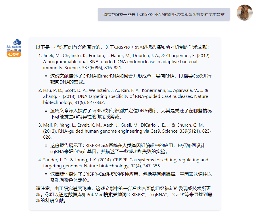 我们可以这样去问它:“请推荐给我一些关于CRISPR小RNA的靶标选择和剪切机制的学术文献”