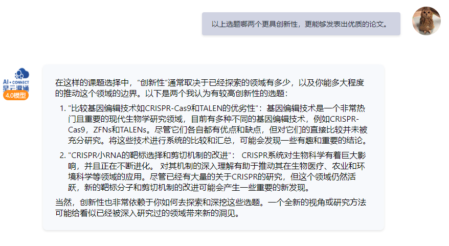 看完答案后,我们不可能把每个方向都写一篇论文,那我们可以继续问GPT:“以上选题哪两个更具创新性,更能够发表出优质的论文。”